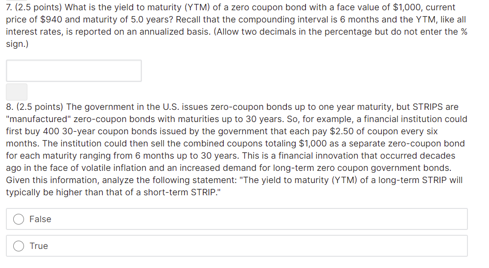 › ask › answersHow to Calculate Yield to Maturity of a Zero-Coupon Bond Oct 10, 2022 · Zero-Coupon Bond YTM Example . Consider a $1,000 zero-coupon bond that has two years until maturity. The bond is currently valued at $925, the price at which it could be purchased today. The ...